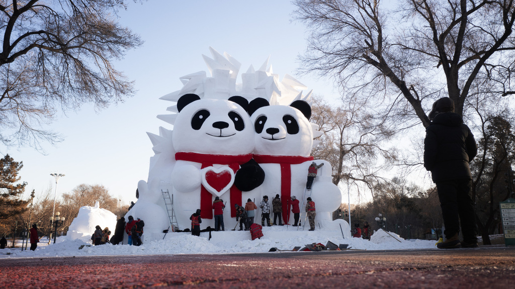 2025年12月12日,黑龙江哈尔滨,太阳岛雪博会大型雪雕《过新年》完工,该雪雕高16米,宽12米,用雪量1500立方米,由40位雕刻师用时3天完成。视觉中国 图